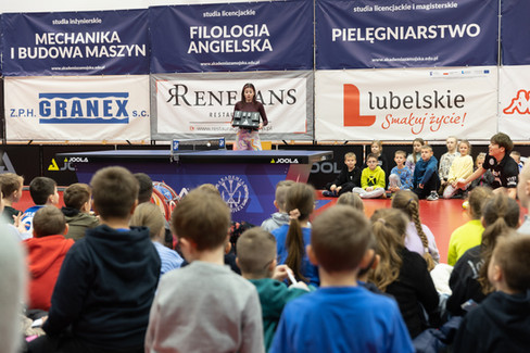 W poniedziałek, 9 grudnia, mieliśmy przyjemność gościć w hali sportowej Akademii Zamojskiej wyjątkowego gościa – Mistrza Tenisa Stołowego, Janka Zandeckiego! Wydarzenie zostało zorganizowane we współpracy z Polskim Związkiem Tenisa Stołowego, a wzięło w nim udział ponad 200 uczniów z klas 1–3 zamojskich szkół podstawowych. To było prawdziwe święto sportu! Dzieci z ogromnym entuzjazmem uczestniczyły w konkursach z nagrodami, zadawały pytania naszemu mistrzowi, a najbardziej odważni zmierzyli się z nim w grze przy stole. Kulminacyjnym punktem wydarzenia był emocjonujący mecz pokazowy pomiędzy Janem Zandeckim a Shodaiem Sakane – zawodnikami drużyny LOTTO Superligi Tenisa Stołowego Akademii Zamojskiej Zamość. Publiczność była zachwycona, a emocje sięgnęły zenitu! Serdecznie dziękujemy wszystkim uczniom, nauczycielom i opiekunom za tak liczne przybycie oraz aktywny udział w wydarzeniu. Cieszymy się, że mogliśmy wspólnie odkrywać tajniki gry w tenisa stołowego i zainspirować młodych miłośników sportu. Zapraszamy do śledzenia naszych kolejnych wydarzeń – do zobaczenia przy stole tenisowym!